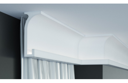 Длина: 2,44 м Высота: 150 мм Перекрытие по потолку: 60 мм Материал: полиуретан Изделие используется в качестве декоративной составляющей карниза для штор, а также для скрытой подсветки
