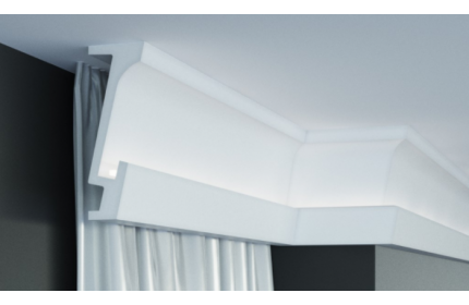 Длина: 2,44 м Высота: 160 мм Перекрытие по потолку: 70 мм Материал: полиуретан Плинтус потолочный для скрытой подсветки, может также использоваться в качестве шторного карниза